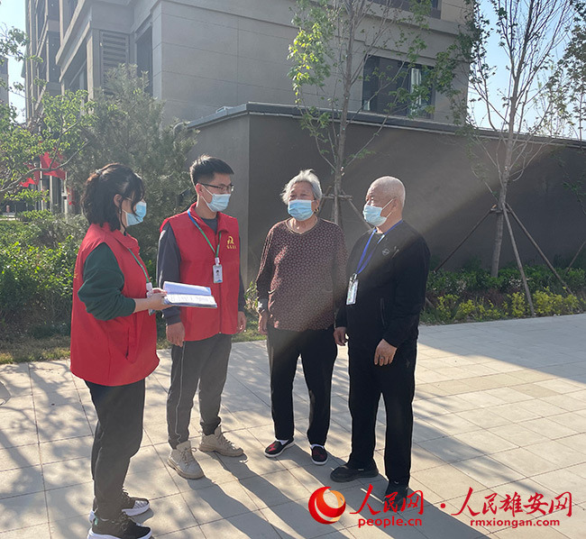圖為東西孫社區(qū)工作者閆云(左一)、張旭東(右一)在走訪居民。容東管委會供圖