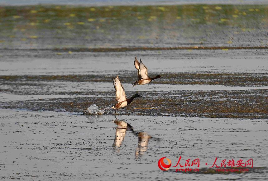 青頭潛鴨飛躍白洋淀水面。張學(xué)農(nóng)攝