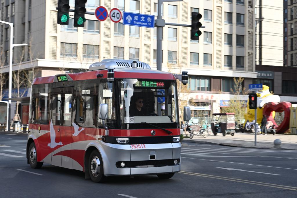 3月29日,無(wú)人駕駛智能網(wǎng)聯(lián)巴士在雄安新區(qū)容東片區(qū)道路上行駛。新華社記者牟宇 攝