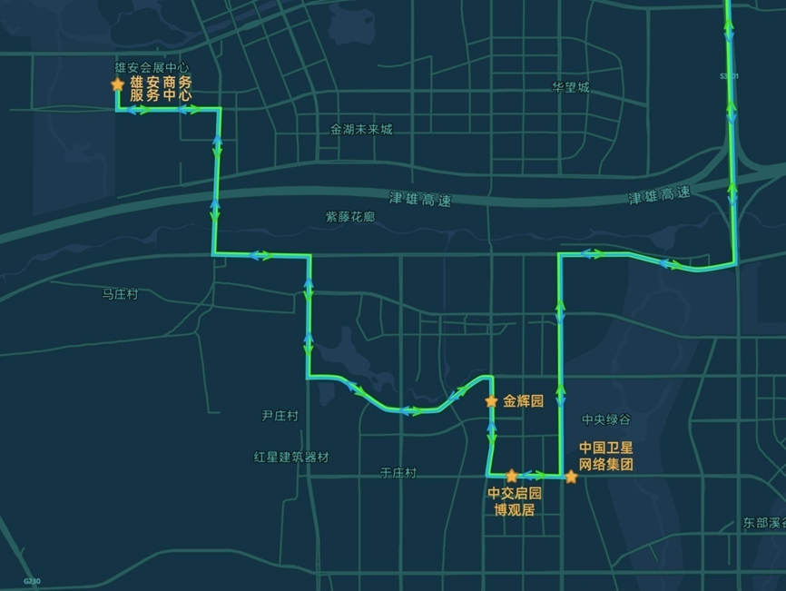 雄安新區(qū)設(shè)置4個(gè)上下客站點(diǎn),從雄安商服中心站始發(fā),途經(jīng)博觀居站、金輝園站、中國星網(wǎng)站。