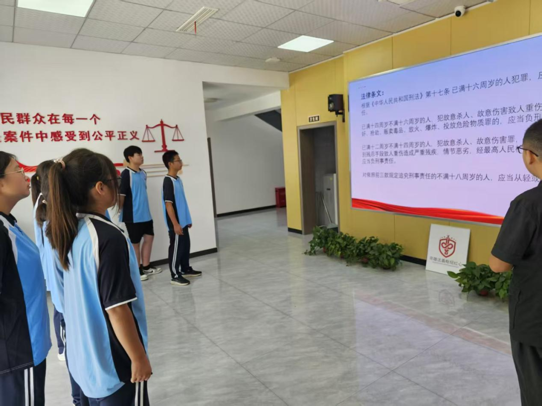老師和學(xué)生們參觀了安檢室、信訪接待室、調(diào)解室、訴訟服務(wù)中心,負責(zé)人郭智輝介紹法庭黨建和審判融合工作開展情況,如何以“黨建紅”引領(lǐng)“法治藍”,以司法裁判為“盾”筑牢法律底線,老師和學(xué)生們對黨建和審判融合工作有了深入的了解。