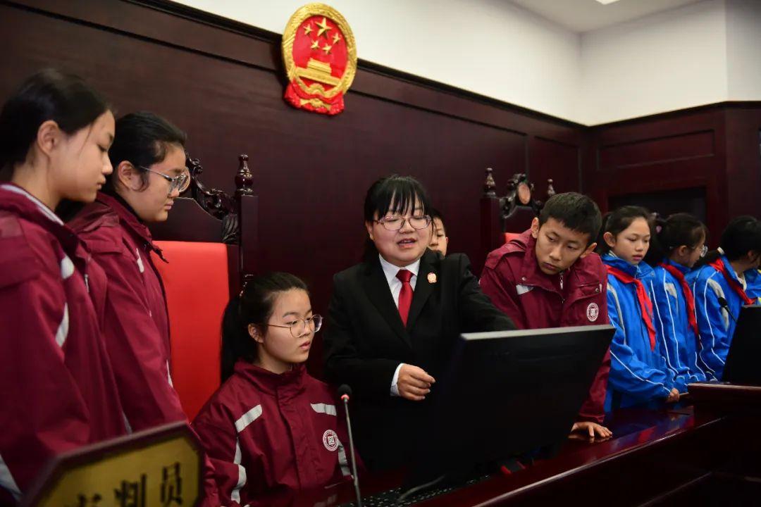 在貴州省高級(jí)人民法院高山流水銅浮雕前,大家認(rèn)真聽(tīng)取講解員介紹,了解審判文化、法治文化。“大家知道民事審判法庭和刑事審判法庭的區(qū)別嗎?”走進(jìn)審判法庭,大家興致勃勃地觀摩了解智慧庭審系統(tǒng)功能、審判法庭設(shè)置等,湊到話筒前,直觀感受智能語(yǔ)音識(shí)別等智能輔助功能的便捷高效。