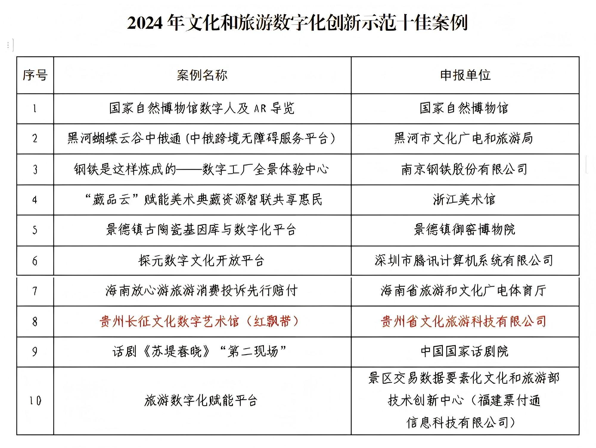 近日,文化和旅游部公布了2024年文化和旅游數(shù)字化創(chuàng)新示范十佳案例,集中示范推廣文化和旅游領(lǐng)域數(shù)字化創(chuàng)新的最新成果?!百F州長(zhǎng)征文化數(shù)字藝術(shù)館(紅飄帶)”入選2024年文化和旅游數(shù)字化創(chuàng)新示范十佳案例。