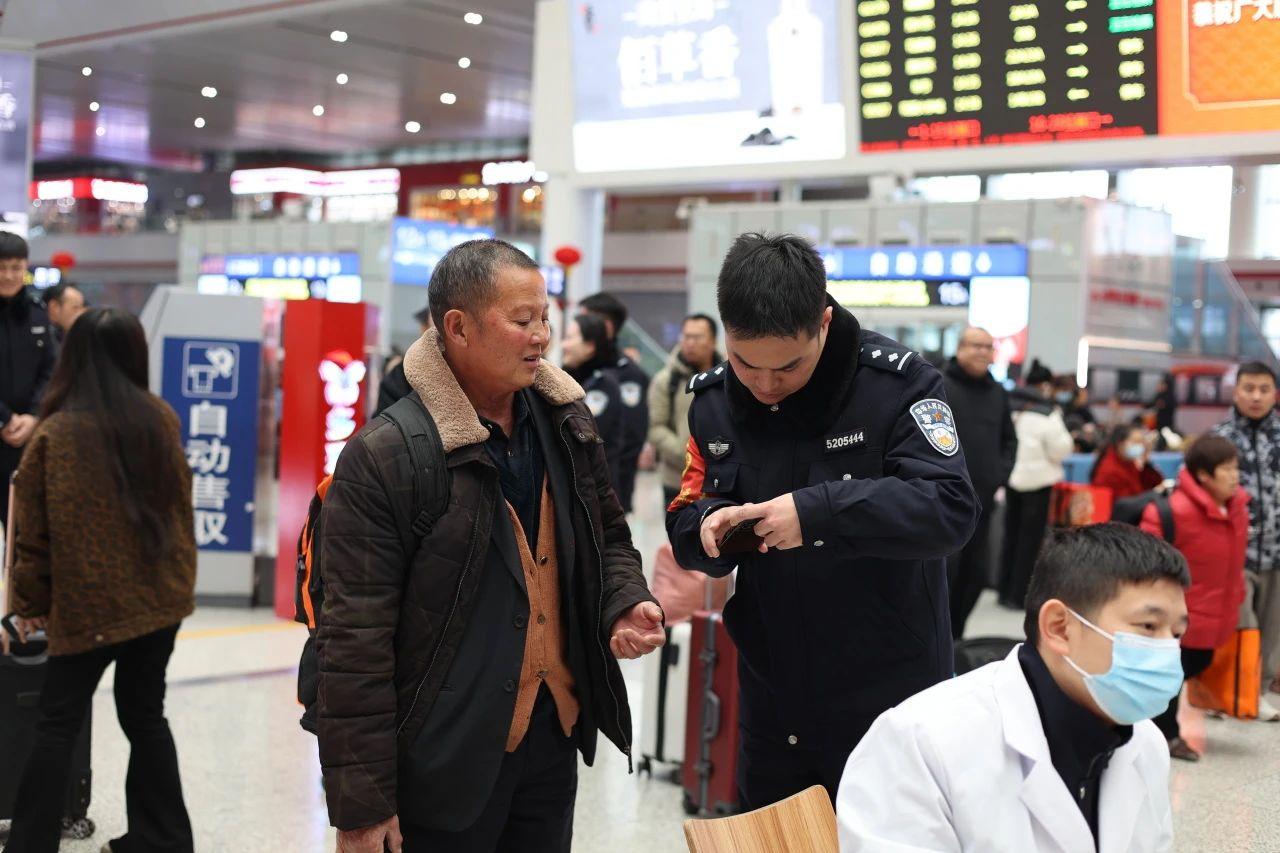 “注意腳下,請往這邊走?!薄澳?,您的檢票口在前面右轉(zhuǎn)?!薄拔襾韼湍嵝欣畎?!”在貴陽北站候車室內(nèi),戴著紅袖套的志愿者民警們?yōu)槁每吞峁┳稍冎敢?、搬運行李、電子取票等溫馨服務(wù),用這一抹紅色點綴春運,用實際行動溫暖寒冬。