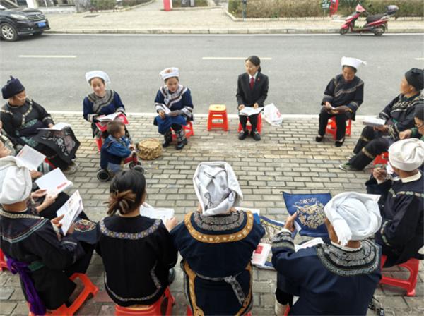 “重婚有違民法典,包辦買賣不對(duì)路,朝三暮四不可取,養(yǎng)老育兒是義務(wù)?!崩C娘們創(chuàng)作的普法水歌生動(dòng)有趣。在雪花湖社區(qū)“繡娘之家”,繡娘們坐在板凳上一邊刺繡一邊興致勃勃地唱著。韋應(yīng)麗介紹說:“在水鄉(xiāng),群眾愛唱歌但識(shí)字不多,學(xué)習(xí)法律有困難。所以我們的繡娘不僅要成為矛盾糾紛調(diào)解的行家,更要成為合格的普法員。”繡娘們將國家法律法規(guī)和政策編排成“調(diào)解歌”“新時(shí)代女性歌”“孝老愛親歌”“禁毒防邪歌”等少數(shù)民族山歌,唱給群眾聽,讓大家一聽就懂,多聽還能跟著哼唱,對(duì)法律知識(shí)更感興趣,真正做到聽得懂、記得住、用得上。