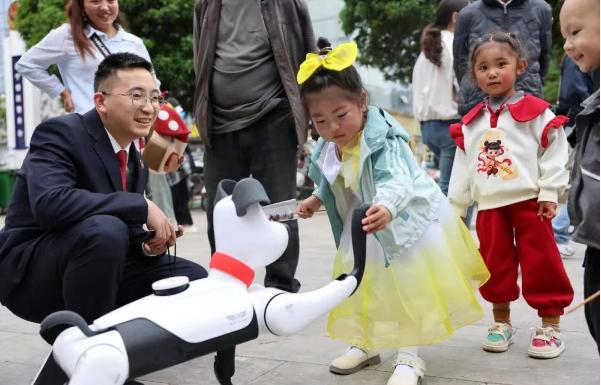 活動現(xiàn)場,一位特殊的“普法宣傳員”——智能普法機(jī)器狗“小白”閃亮登場,瞬間成為全場焦點(diǎn)。這只靈活可愛的機(jī)器狗不僅能自如行走、做出俏皮動作,更能通過內(nèi)置的普法知識庫,用孩子們喜聞樂見的語言和方式,生動講解《中華人民共和國未成年人保護(hù)法》中的“家庭保護(hù)”“學(xué)校保護(hù)”“社會保護(hù)”以及民法典中關(guān)于未成年人權(quán)益保障的相關(guān)條款。它機(jī)智的回答、萌萌的互動,引得小朋友們紛紛圍觀、踴躍提問,在歡聲笑語中將法治的種子悄然播撒心田。