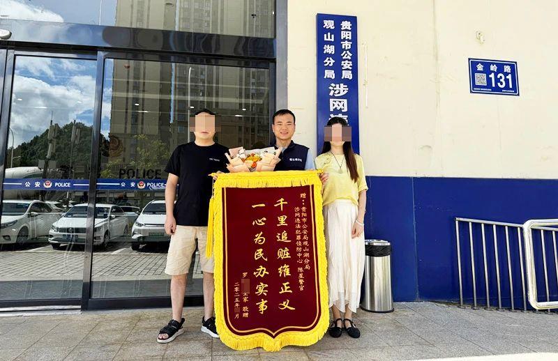 近日,群眾羅先生將一面印著“千里追贓維正義 一心為民辦實(shí)事”字樣的錦旗送到了貴州省貴陽市公安局觀山湖分局涉網(wǎng)違法犯罪偵防中心,感謝反詐民輔警幫其挽回被騙損失。