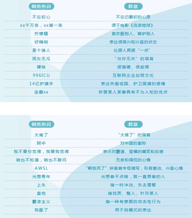 法制網(wǎng)監(jiān)測(cè)中心(ID:fzwyqzx)綜合國家語言資源監(jiān)測(cè)與研究中心、《咬文嚼字》雜志、《語言文字周報(bào)》等權(quán)威發(fā)布,選取了2019年較有代表性的20個(gè)網(wǎng)絡(luò)熱詞。通過對(duì)這些網(wǎng)絡(luò)熱詞所反映的新特征進(jìn)行分析,總結(jié)我國網(wǎng)民輿論心態(tài)和網(wǎng)絡(luò)情感變化的四點(diǎn)新趨勢(shì)。