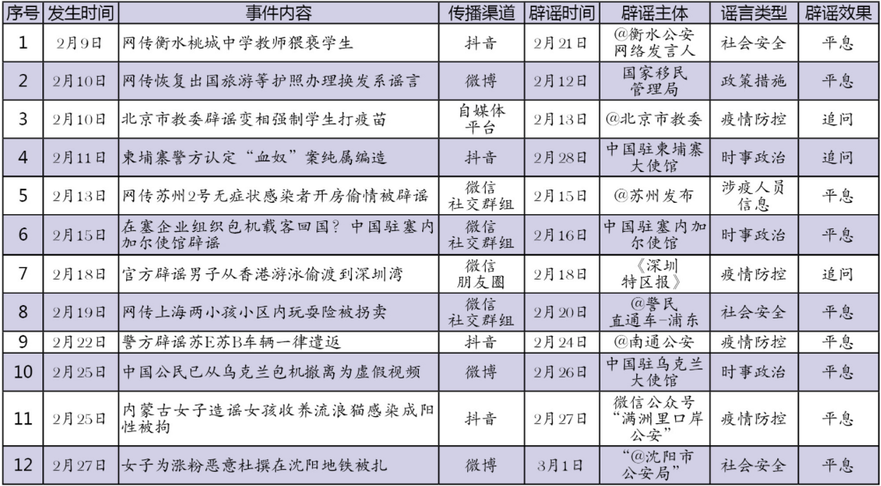 2月網(wǎng)絡(luò)涉法謠言辟謠榜單共梳理、匯總12起熱點(diǎn)事件,圍繞謠言持續(xù)時(shí)間、傳播渠道、產(chǎn)生地域、類型以及辟謠主題等維度綜合分析。法治網(wǎng)輿情中心從中篩選兩起關(guān)注度較高、具有典型意義的案例研判,以期為網(wǎng)絡(luò)辟謠工作提供參考借鑒。