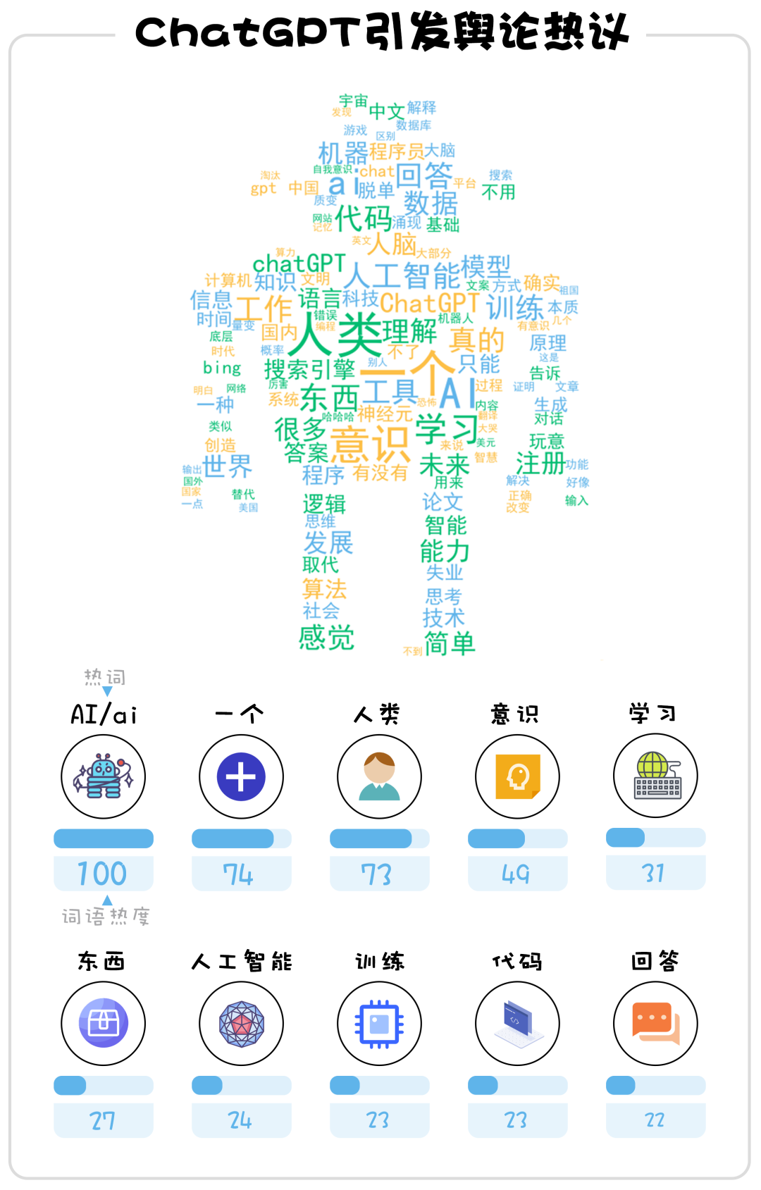 (制作:法治網(wǎng)輿情中心 數(shù)據(jù)來(lái)源:以“ChatGPT”“改變”“崗位”為關(guān)鍵詞,在嗶哩嗶哩搜索熱度較高的視頻,選取近6000條彈幕及一級(jí)評(píng)論,對(duì)所選數(shù)據(jù)進(jìn)行NLP分析,將出現(xiàn)次數(shù)最多的詞語(yǔ)規(guī)定為100,以該詞語(yǔ)為基準(zhǔn)對(duì)其他熱詞進(jìn)行等尺度放縮)
