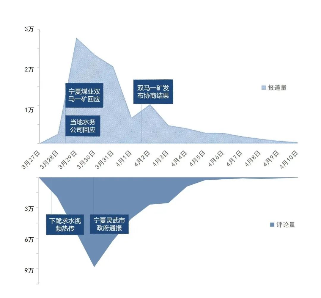 3月29日,部分中央主流媒體發(fā)聲表態(tài):“@中國新聞網(wǎng)”稱“‘缺水’的輿論場需要真相甘霖”;央廣網(wǎng)推出文章《萬畝治沙林被煤礦“斷水”?供水和調(diào)查必須馬上到位》,指出當(dāng)?shù)乇仨毐M快用客觀公正的調(diào)查還原真相,給林場主一個交代,給萬畝林場一個交代,也給公眾一個交代。輿論場還曝光一份判決書,顯示寧夏回族自治區(qū)銀川市中院曾作出判決,明確該煤礦占用林地,要求賠償孫國友727.54萬元。另據(jù)九派新聞報道,當(dāng)?shù)厮畡?wù)公司負責(zé)人稱,礦場污水處理達標,但是水的鹽分過高澆不了樹。煤礦一方稱,污水處理設(shè)備容量比較小,每天只能處理兩千立方,且資金成本太大,不想加大投入。靈武市政府相關(guān)人員向媒體表示,正在針對此事協(xié)調(diào)處理。當(dāng)日,“#萬畝樹木被煤礦斷水面臨枯死#”“#水務(wù)公司回應(yīng)萬畝林場主跪地求供水#”等相關(guān)微博話題沖上熱搜榜前列,輿情熱度達到峰值。部分網(wǎng)民表示,經(jīng)歷了沙塵暴,才能真正明白造林治沙的好處和難處,“不能讓好人流汗流淚又流血”。微博大V“@胡錫進”也呼吁,希望不用下跪崩潰引起巨大輿情也能正常解決。