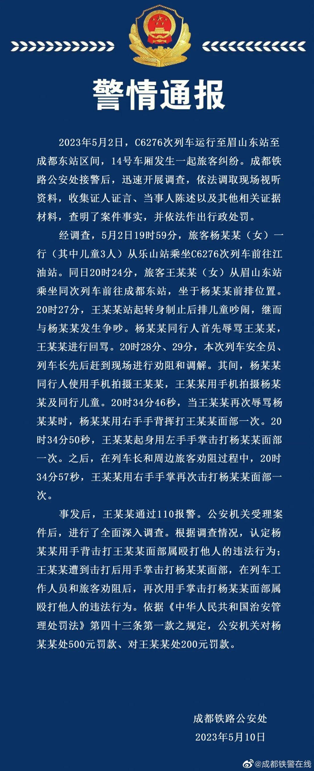 面對網(wǎng)絡質(zhì)疑,5月10日,成都鐵路公安處官方微博“@成都鐵警在線”發(fā)布警情通報稱,根據(jù)調(diào)查情況,認定楊某某用手背擊打王某某面部屬毆打他人的違法行為;王某某遭到擊打后用手掌擊打楊某某面部,在列車工作人員和旅客勸阻后,再次用手掌擊打楊某某面部屬毆打他人的違法行為。警方據(jù)此認為雙方均違反治安管理處罰法,并處以不同金額的罰款。隨后,四川廣播電視臺“@四川觀察”、封面新聞公布現(xiàn)場視頻,涉及列車車廂監(jiān)控、列車長巡檢記錄儀、當事雙方手機所拍視頻等多個角度,直觀地呈現(xiàn)雙方發(fā)生爭執(zhí)繼而爆發(fā)肢體沖突的過程。網(wǎng)絡討論熱度再次攀升,微博上形成“#高鐵掌摑事件雙方曾多次對罵#”“#高鐵被打女子2次打人被認定違法#”“#王某某被打后兩次掌摑楊某某#”等多個話題,不少網(wǎng)民一改之前支持王某某的立場。但部分網(wǎng)民仍從情感角度出發(fā),質(zhì)疑官方對視頻進行二次剪輯,認為警方苛求被打者還擊的間隔時間有失公平。