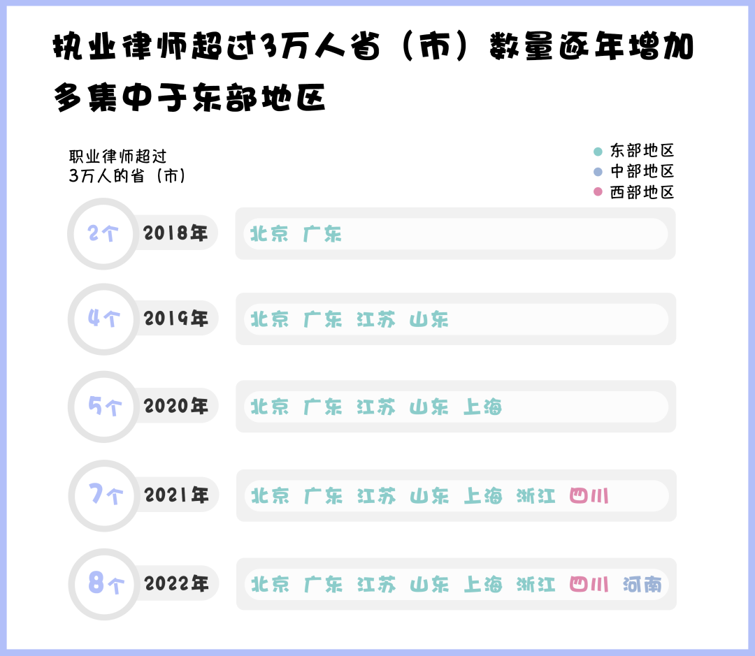 1. 律師人數(shù)超過3萬人的?。ㄊ校┒喾植荚跂|部地區(qū)