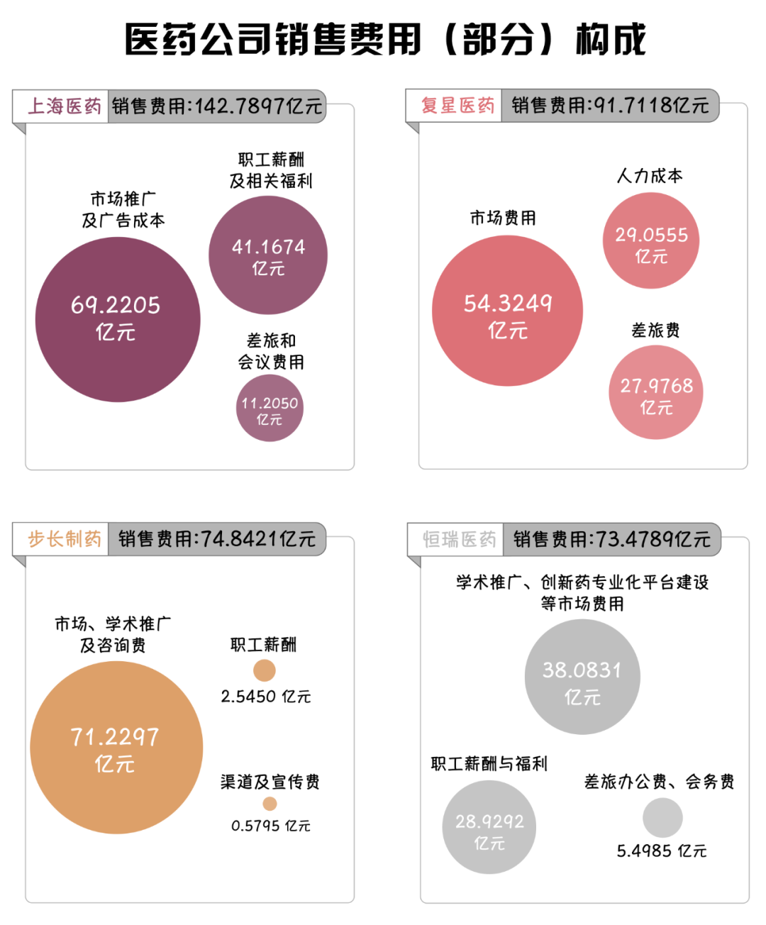 從藥企的銷售費(fèi)用構(gòu)成來(lái)看,分析2022年行業(yè)內(nèi)銷售費(fèi)用前4名的藥企可以看出,銷售費(fèi)用多用于市場(chǎng)、學(xué)術(shù)推廣、職工薪酬及福利。