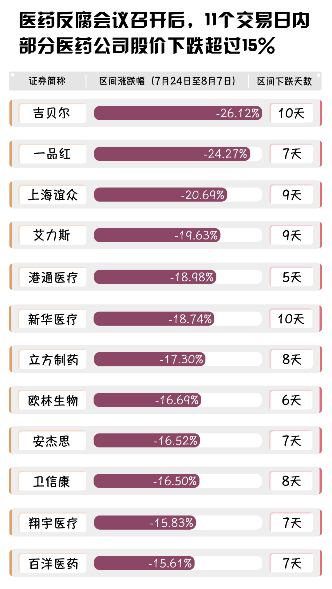 自7月21日,國(guó)家衛(wèi)健委聯(lián)合多部門召開(kāi)醫(yī)藥反腐整治會(huì)議后,藥企所受到的沖擊可從股市中窺探一二。根據(jù)wind(萬(wàn)得)發(fā)布的數(shù)據(jù)來(lái)看,從會(huì)后的第一個(gè)交易日(7月24日)以來(lái),11個(gè)交易日內(nèi),共有12家醫(yī)藥企業(yè)股價(jià)跌幅超過(guò)15%,其中11家藥企股價(jià)下跌天數(shù)在7天及以上。