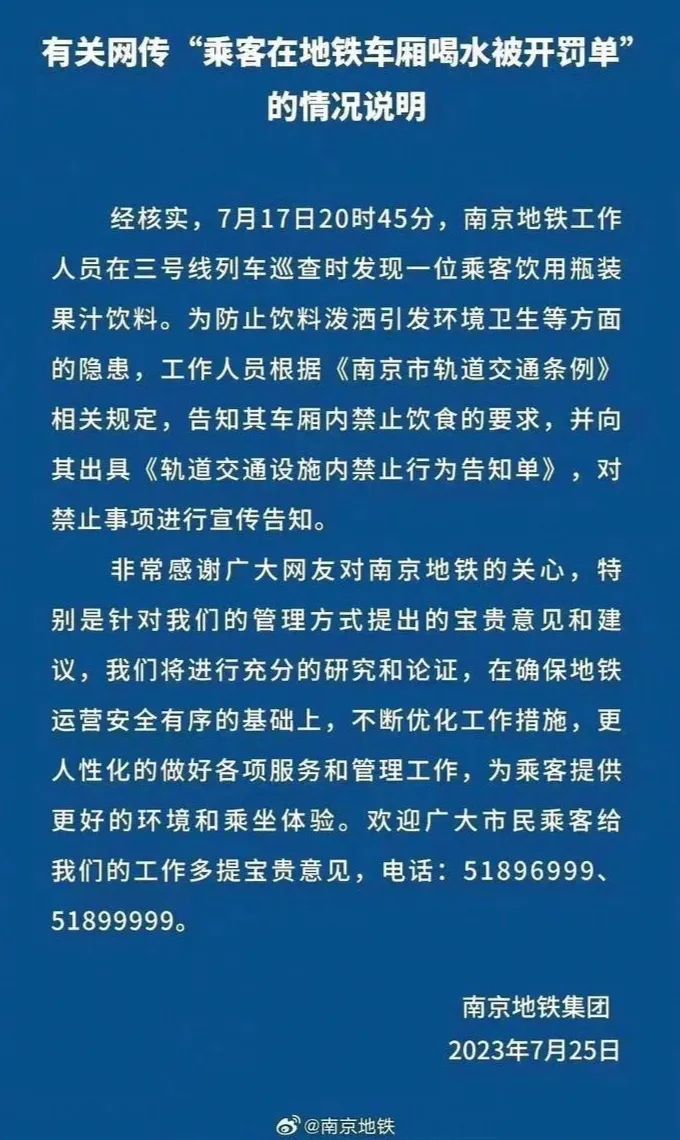 當日18時許,南京地鐵在其官方微博發(fā)布《有關網傳“乘客在地鐵車廂喝水被開罰單”的情況說明》,文中稱,工作人員在列車巡查時發(fā)現一位乘客飲用瓶裝果汁飲料,為防止飲料潑灑引發(fā)環(huán)境衛(wèi)生等方面的隱患,工作人員根據相關規(guī)定,向其出具《軌道交通設施內禁止行為告知單》,對禁止事項進行宣傳告知。南京地鐵還表示,將“不斷優(yōu)化工作措施,更人性化地做好各項服務和管理工作”。