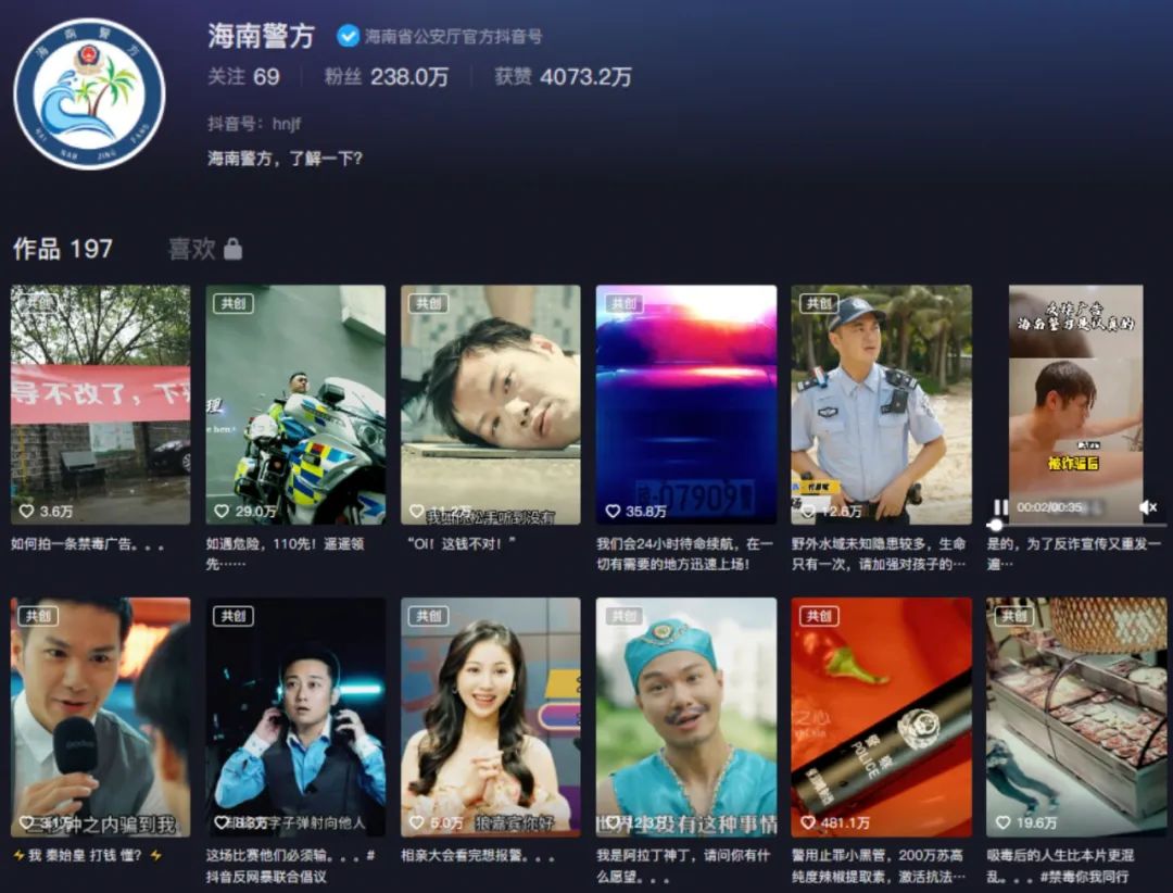 豐富的傳播渠道和多樣的共創(chuàng)模式可以說(shuō)是“海南警方”短視頻成功破圈的基礎(chǔ)。在傳播渠道方面,“海南警方”拍攝的短視頻會(huì)依據(jù)內(nèi)容形式,首先投放在抖音、快手以及微信視頻號(hào)等平臺(tái),通過(guò)擴(kuò)充社交媒體傳播渠道,最大范圍內(nèi)汲取公域流量,打好用戶底盤(pán)。除了以短視頻平臺(tái)為核心的投放策略外,“海南警方”還利用其他平臺(tái)作為引流渠道,如以日常工作宣傳為主的今日頭條和微博上,“海南警方”發(fā)布對(duì)應(yīng)的視頻合集,嘗試突破平臺(tái)壁壘,最大程度吸引網(wǎng)民注意力。在創(chuàng)作方式上,“海南警方”根據(jù)視頻內(nèi)容與其他賬號(hào)合作,如《這錢(qián)不對(duì)》和《禁毒版盜夢(mèng)空間》兩部作品,由于涉及反邪教和禁毒題材,“海南警方”分別與中國(guó)反邪教和海南禁毒合作拍攝,這種基于宣傳主旨達(dá)成的合作模式可以幫助賬號(hào)有效拓展分眾渠道,觸達(dá)更多用戶?!昂D暇健边€有部分視頻是與下級(jí)公安的合作,包括昌江警方、澄邁警方等,這一方面可以發(fā)揮海南警方的虹吸效應(yīng),聚合更多流量助推宣傳效果,另一方面也可以反哺弱勢(shì)賬號(hào),打造傳播矩陣,為普法宣傳開(kāi)辟更多通路。
