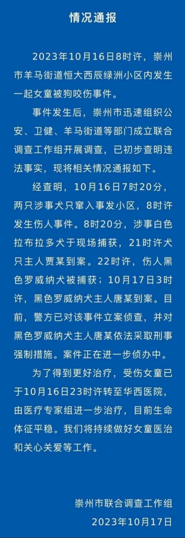事發(fā)當(dāng)日17時許,崇州公安發(fā)布首份通報,稱被咬女童生命體征平穩(wěn),正全力展開調(diào)查處置工作。輿論場中不少網(wǎng)民探究事發(fā)原因,認為養(yǎng)犬規(guī)定落實不到位,導(dǎo)致遛狗不牽繩、飼養(yǎng)烈性犬等亂象出現(xiàn)。10月17日,據(jù)受傷女童母親透露,涉事黑犬已被找到,警方還在排查狗主人。另有媒體報道稱,成都禁養(yǎng)22種烈性犬不包括羅威納,部分網(wǎng)民對警方工作效率表達不滿情緒。
