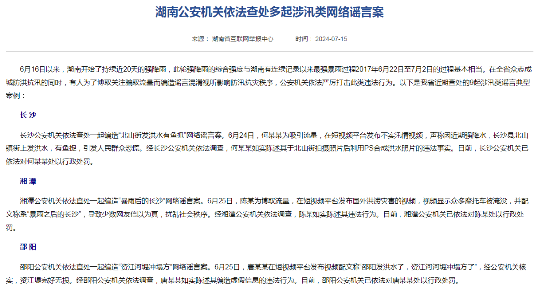 二是夸大災(zāi)情險情。此類謠言主要通過捏造數(shù)據(jù)、刻畫細(xì)節(jié)、綁架“官方”等伎倆,夸大災(zāi)情險情,增強(qiáng)謠言的“可信度”。較為常見的是利用聳人聽聞的傷亡數(shù)據(jù)捏造受災(zāi)嚴(yán)重的假象,招致人心惶惶。如湖南暴雨期間,常德市一網(wǎng)民在短視頻平臺發(fā)布居住地附近漲水視頻,編造稱“俺這里天天下雨,天天死人,半個月,三四十個人”,瀏覽量迅速破10萬次,遭到行政處罰;平江縣一網(wǎng)民在微信平臺造謠稱“很多尸體隨汨羅江被沖走,3萬多人不見了”被行政拘留。四川暴雨期間,曾某某在抖音平臺編造“達(dá)州洪災(zāi)致4人死亡1人失聯(lián)”虛假信息被行政處罰等。再者,謠言詳細(xì)說明災(zāi)害時間、地點及經(jīng)過等,給人一種如臨現(xiàn)場之感,難辨真假。如賬號“正能量實事說事”謊稱“岳陽市君山區(qū)許市鎮(zhèn)的堤防突然決口,洪水傾瀉而入,瞬間淹沒大片農(nóng)田和村莊,數(shù)千名群眾被洪水圍困,消防、武警等救援力量正展開緊急救援”。隨著文章在各大社交平臺擴(kuò)散,恐慌情緒蔓延至線下,一些商家趁機(jī)哄抬物價,部分家庭甚至開始準(zhǔn)備撤離。還有網(wǎng)民模仿權(quán)威發(fā)布,使用“嚴(yán)峻”“危急”等標(biāo)題,煽動恐慌情緒。如廣西桂林遭遇超歷史紀(jì)錄洪水,抖音網(wǎng)民“土豆炒馬鈴薯”發(fā)布一則“情況緊急的新聞通知”造謠稱“接到上級電話,平樂縣新田水庫塌了”,引發(fā)不知情的網(wǎng)民留言追問情況。