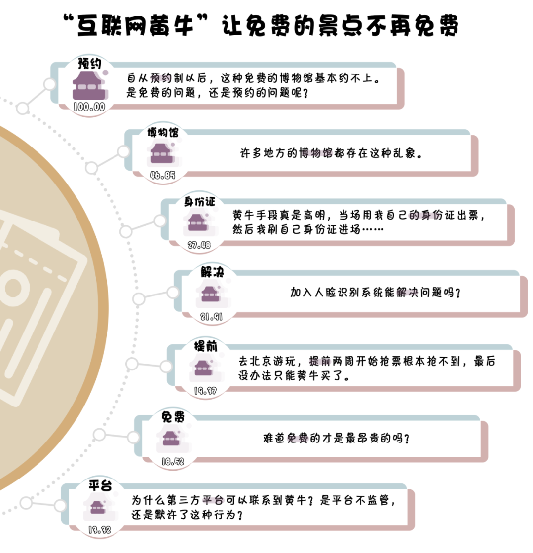 如此“作弊”手段引發(fā)輿論熱議。有網(wǎng)民表示,多地免費(fèi)景點(diǎn)都存在預(yù)約不上的現(xiàn)象,想去游玩必須花錢,其中博物館成“重災(zāi)區(qū)”;有網(wǎng)民感嘆“互聯(lián)網(wǎng)黃?!笔侄沃呙髁钊瞬坏貌环?,其已經(jīng)默許了“互聯(lián)網(wǎng)黃?!爆F(xiàn)象;部分網(wǎng)民反映,某些第三方平臺(tái)上,免費(fèi)預(yù)約門票被裹上“講解服務(wù)”“研學(xué)套餐”等外衣,搖身一變成為貨架上的商品,不禁令人發(fā)問(wèn),“互聯(lián)網(wǎng)黃牛”為何可以明目張膽地在第三方平臺(tái)上售賣免費(fèi)預(yù)約門票?是官方平臺(tái)監(jiān)管不力、置之不理,還是其授意“互聯(lián)網(wǎng)黃牛”與第三方平臺(tái)相互串通謀取利益?