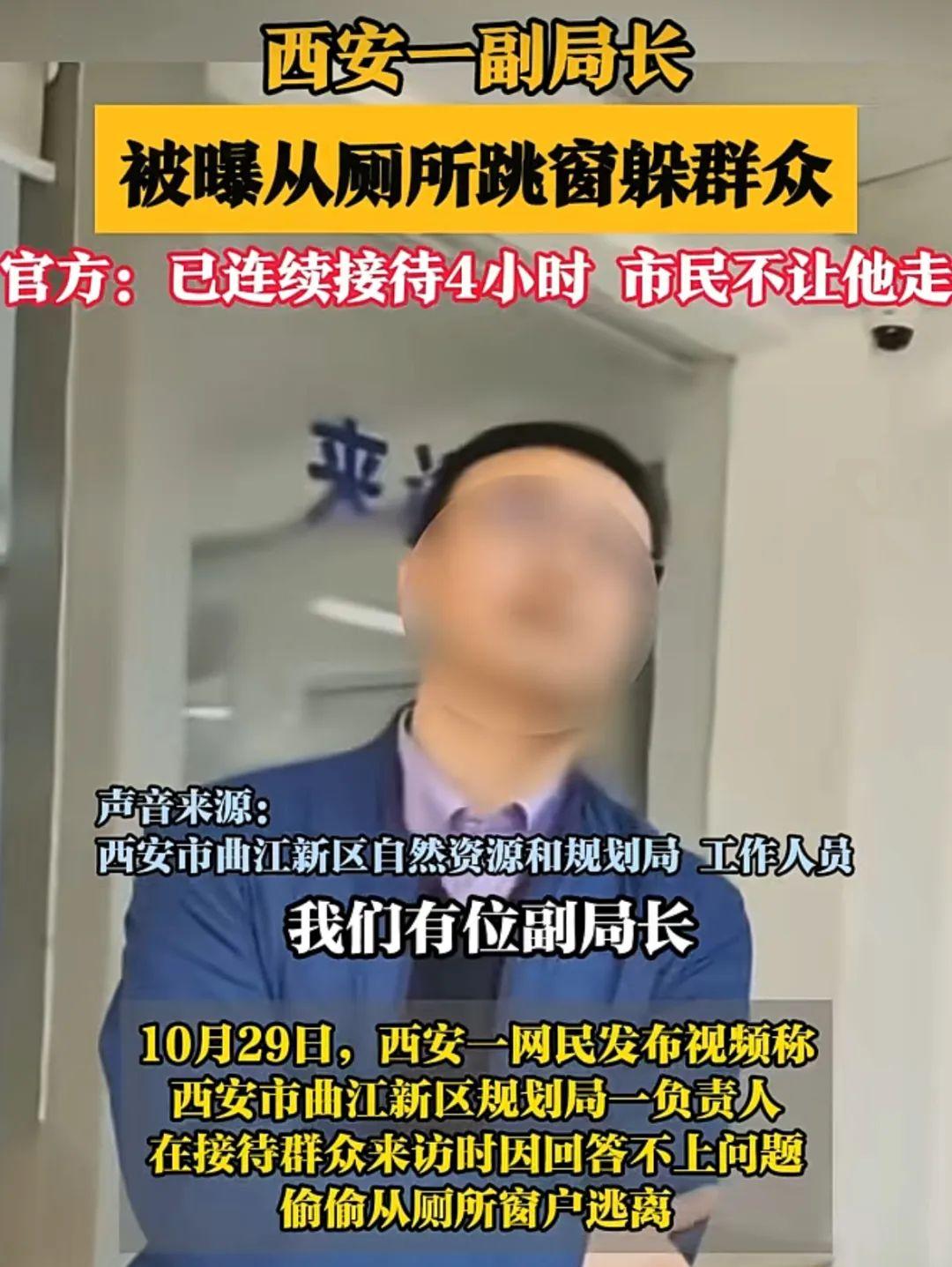 10月28日,一則“官員跳窗逃跑”的視頻在網(wǎng)絡(luò)傳播。視頻顯示,多名群眾將一名身著藍(lán)色上衣的男子圍住,疑似就房屋拆遷問(wèn)題進(jìn)行爭(zhēng)執(zhí)。圍觀群眾有的拍桌子,有的大聲呼喊,稱(chēng)“今天不給個(gè)說(shuō)法,誰(shuí)也別想離開(kāi)這里”等,隨后該男子從廁所跳窗逃走。10月29日,大皖新聞、《瀟湘晨報(bào)》等多家媒體報(bào)道此事。據(jù)爆料的西安市民反映,其上訪是因?yàn)樽约杭腋浇诓疬w,當(dāng)?shù)鼐用癜l(fā)現(xiàn)政府部門(mén)最新規(guī)劃的地理位置與最初承諾的不一樣,且距離高壓線過(guò)近。當(dāng)日下午,西安市曲江新區(qū)自然資源和規(guī)劃局工作人員通過(guò)媒體回應(yīng)稱(chēng),視頻人物是該局一名副局長(zhǎng),其從九點(diǎn)多到下午一點(diǎn)多一直在接訪,但市民不讓其離開(kāi),無(wú)奈之下從窗戶離開(kāi)。針對(duì)群眾反映的情況,該局也在研究高壓線設(shè)備的遷移問(wèn)題,后續(xù)將進(jìn)一步加強(qiáng)與征遷市民的溝通交流,爭(zhēng)取妥善處理。10月30日下午,“@封面新聞”報(bào)道稱(chēng),針對(duì)工作人員在接訪期間的不當(dāng)行為,曲江新區(qū)黨工委、管委會(huì)高度重視,已安排紀(jì)檢監(jiān)察機(jī)關(guān)聯(lián)合相關(guān)部門(mén)啟動(dòng)調(diào)查程序。當(dāng)?shù)毓俜降目焖偬幹糜行Ь徍洼浨?,但事件帶?lái)的討論為公職人員和政府部門(mén)應(yīng)對(duì)網(wǎng)絡(luò)輿情提供思路和借鑒。