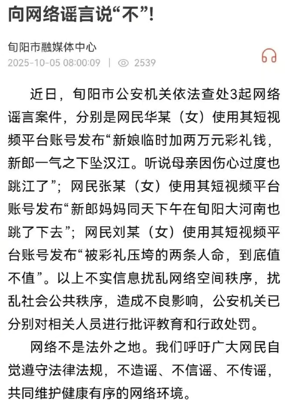 同日,陜西安康旬陽市融媒體中心發(fā)布消息稱,近日,旬陽市周某某跳河事件發(fā)生后,有個(gè)別網(wǎng)民為吸粉引流、博取眼球,故意歪曲事實(shí)、惡意炒作,在相關(guān)網(wǎng)絡(luò)社交平臺(tái)編造、散布謠言,擾亂網(wǎng)絡(luò)空間秩序,造成了不良社會(huì)影響。網(wǎng)民張某、黃某、萬某在短視頻賬戶發(fā)布相關(guān)虛假信息,造成不良影響,已被公安機(jī)關(guān)以涉嫌尋釁滋事罪立案?jìng)刹椤a槍?duì)周某某跳河事件虛構(gòu)事實(shí)擾亂公共秩序的違法行為,旬陽市公安機(jī)關(guān)已立刑事案件3起,受理行政案件20起。輿論普遍表示,官方展現(xiàn)了治理謠言的決心,認(rèn)為制止謠言最好的方法就是公布調(diào)查結(jié)果。