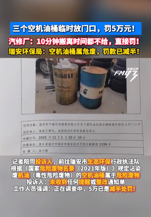 11月4日,據(jù)溫州市新聞傳媒中心《溫州晚間報(bào)道》欄目報(bào)道,溫州瑞安一汽修店負(fù)責(zé)人彭先生求助稱,近日因廠里地面做地坪漆,臨時(shí)將三個(gè)空機(jī)油桶挪到門口,11月1日瑞安市生態(tài)環(huán)保行政執(zhí)法隊(duì)到店檢查,當(dāng)場(chǎng)對(duì)此定性為“隨意擺放危險(xiǎn)廢物”,直接通知要對(duì)該違法行為處罰5萬(wàn)元,執(zhí)法人員稱“簽字認(rèn)罰5萬(wàn)、不簽字則罰10萬(wàn)”。彭先生認(rèn)為處罰過(guò)重,無(wú)法接受。