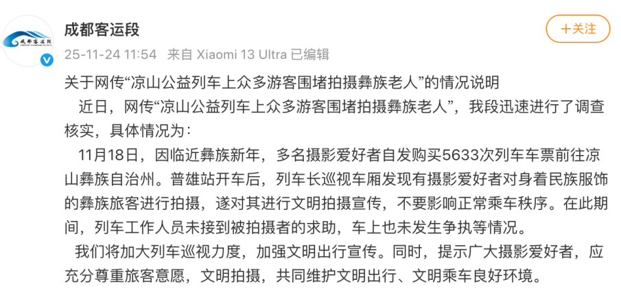 11月24日12時許,“@成都客運(yùn)段”發(fā)布情況說明稱,因臨近彝族新年,近日多名攝影愛好者乘坐5633次列車前往涼山彝族自治州。普雄站開車后,列車長巡視車廂發(fā)現(xiàn)有攝影愛好者對身著民族服飾的彝族旅客進(jìn)行拍攝,遂對其進(jìn)行文明拍攝宣傳,不要影響正常乘車秩序。在此期間,列車工作人員未接到被拍攝者的求助,車上也未發(fā)生爭執(zhí)等情況。今后將加大列車巡視力度,加強(qiáng)文明出行宣傳。