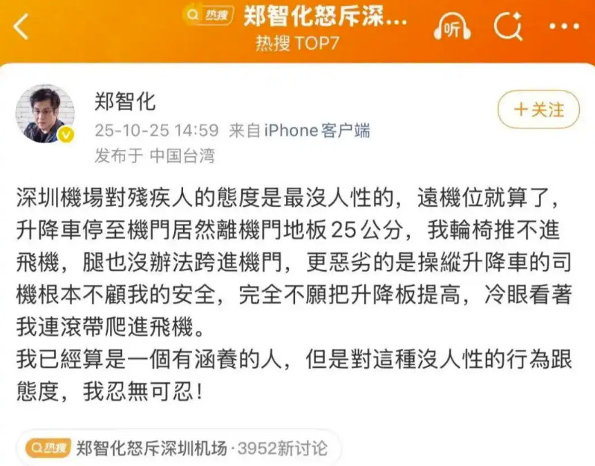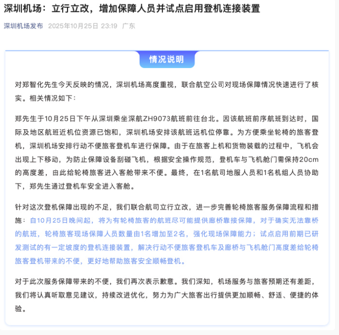 10月25日14時(shí)59分,中國(guó)臺(tái)灣歌手鄭智化通過微博賬號(hào)發(fā)文控訴其在深圳機(jī)場(chǎng)遭遇“不人性”對(duì)待:“操縱升降車的司機(jī)根本不顧我的安全,完全不愿把升降板提高,冷眼看著我連滾帶爬進(jìn)飛機(jī)?!?小時(shí)后,相關(guān)話題出現(xiàn)在微博熱搜榜上,引發(fā)網(wǎng)民一致聲討涉事機(jī)場(chǎng)。當(dāng)日18時(shí)許,深圳機(jī)場(chǎng)在該微博評(píng)論區(qū)留言致歉,表示已啟動(dòng)核查,將以此為契機(jī)優(yōu)化特殊旅客的服務(wù)保障細(xì)節(jié)。23時(shí)許,深圳機(jī)場(chǎng)通過微信公眾號(hào)再發(fā)情況說明,稱將進(jìn)一步完善廊橋靠接保障、人員增配等多項(xiàng)整改措施,更好幫助旅客安全順暢登機(jī)。