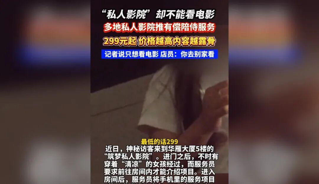 12月19日,江蘇廣電總臺(tái)荔枝新聞中心《神秘訪(fǎng)客》發(fā)布暗訪(fǎng)報(bào)道,揭露西安、成都、三亞等多地私人影院出現(xiàn)有償陪侍等違規(guī)服務(wù)。其中,西安“筑夢(mèng)私人影院”強(qiáng)制顧客選購(gòu)陪侍套餐,相關(guān)項(xiàng)目名稱(chēng)露骨;成都“云水謠私人影院”地址虛假,隱蔽提供有償陪侍及“擦邊”游戲服務(wù);三亞貝貝私影俱樂(lè)部的簡(jiǎn)介中,詳細(xì)列明了各種服務(wù)以及對(duì)應(yīng)的報(bào)價(jià),價(jià)格越高,內(nèi)容越露骨。