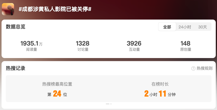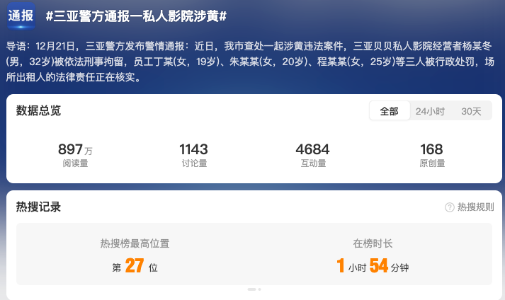 截至12月24日17時(shí),全網(wǎng)相關(guān)信息2.7萬(wàn)余條?!?私人影院強(qiáng)制要求顧客選擇異性陪侍套餐#”“#私人影院異性陪侍4人被刑拘#”“#成都涉黃私人影院已被關(guān)停#”“#涉黃私人影院3名00后女員工被罰#” 等微博話(huà)題閱讀量累計(jì)超1.6億。