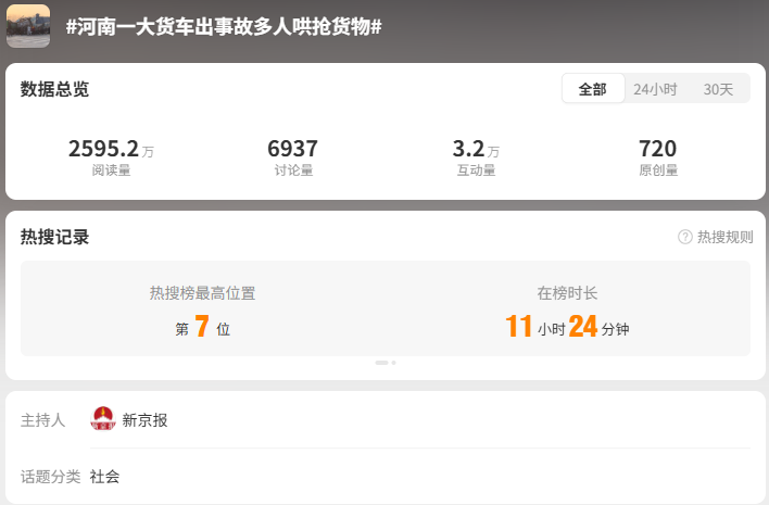 截至12月29日14時,全網(wǎng)相關(guān)信息1.2萬余條,“#河南一大貨車出事故多人哄搶貨物#”“#警方介入貨車出事故貨物遭哄搶#”“#貨車事故貨物被哄搶司機(jī)嘶吼別搶了#” 等相關(guān)微博話題閱讀量累計超3500萬。