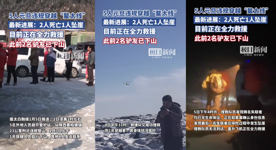 1月3日,有網(wǎng)民發(fā)帖稱“元旦期間5人穿越‘小鰲太線’,4人失聯(lián)”,引發(fā)關(guān)注。1月5日晚,“太白融媒”微信公眾號發(fā)布通報稱,1月2日凌晨2時左右,5名外地人員避開管護(hù)站,從黃柏塬鎮(zhèn)23公里附近違規(guī)登山。1月3日上午,1名穿越人員自行下山,其他4人失去聯(lián)系。當(dāng)?shù)仉S后組織救援人員進(jìn)山全力搜救。1月4日11時,救援隊(duì)成功搜救到1人,其身體狀況良好。1月5日下午4時許,救援隊(duì)又發(fā)現(xiàn)2名失聯(lián)者,已無生命體征,同時發(fā)現(xiàn)最后1名失聯(lián)者在探險過程中發(fā)生墜崖事故,現(xiàn)場坡陡崖高,搜救隊(duì)員無法到達(dá),出動了直升機(jī)全力救援。