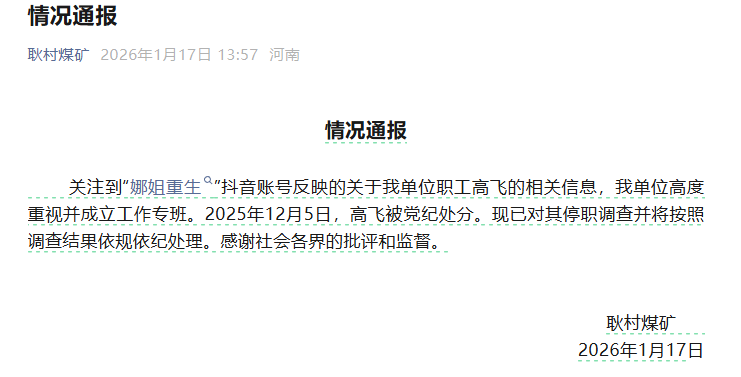 1月17日,男方單位通過(guò)“耿村煤礦”微信公眾號(hào)發(fā)布情況通報(bào)稱,關(guān)注到相關(guān)信息,單位高度重視并成立工作專班。2025年12月5日,高某被黨紀(jì)處分?,F(xiàn)已對(duì)其停職調(diào)查并將按照調(diào)查結(jié)果依規(guī)依紀(jì)處理。另?yè)?jù)“@二三里資訊”報(bào)道,高某被停工,韓某已從原部門調(diào)至洗煤廠工作。