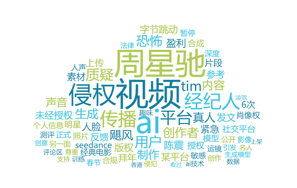 截至2月13日15時,全網相關信息29338條,“#周星馳經紀人問AI周星馳侵權嗎#”“#周星馳經紀人呼吁平臺監(jiān)管AI侵權#”“#律師稱AI周星馳影像標注AI也侵權#”“#即夢暫停參考真人素材生成AI視頻#”“#即夢AI團隊回應深知創(chuàng)意的邊界是尊重#”“#面對AI肖像侵權平臺不能做甩手掌柜#”等相關微博話題累計閱讀量超2356萬。