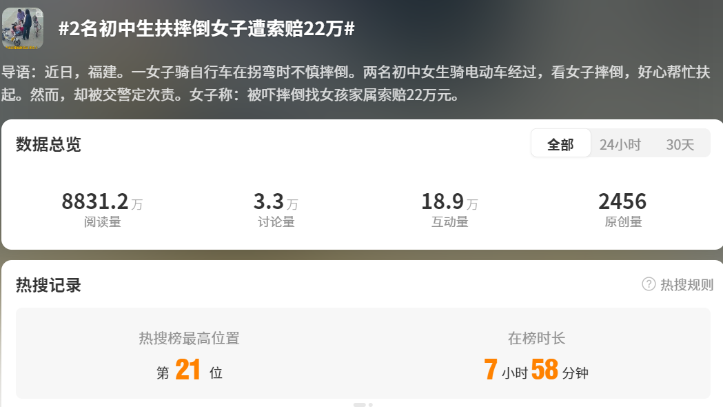 截至2月24日14時,全網(wǎng)信息總量8萬余條,相關話題“#女兒扶人遭索賠22萬媽媽發(fā)聲#”“#2名初中生扶摔倒女子遭索賠22萬#”“#初中生遭索賠22萬爭議焦點在哪#”等累計閱讀量超2億。