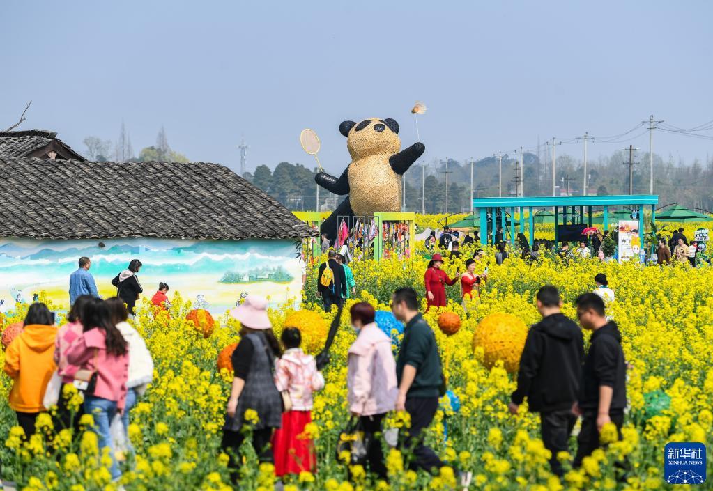 近日,位于四川成都崇州市的數(shù)萬畝油菜花競(jìng)相綻放,吸引游客前來踏春觀光。