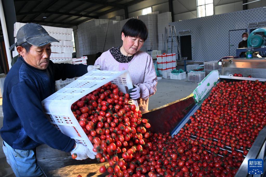 4月1日,菜農(nóng)在棗莊市臺(tái)兒莊區(qū)馬蘭屯鎮(zhèn)按揭農(nóng)業(yè)基地分選包裝西紅柿。記者 范長(zhǎng)國(guó) 攝