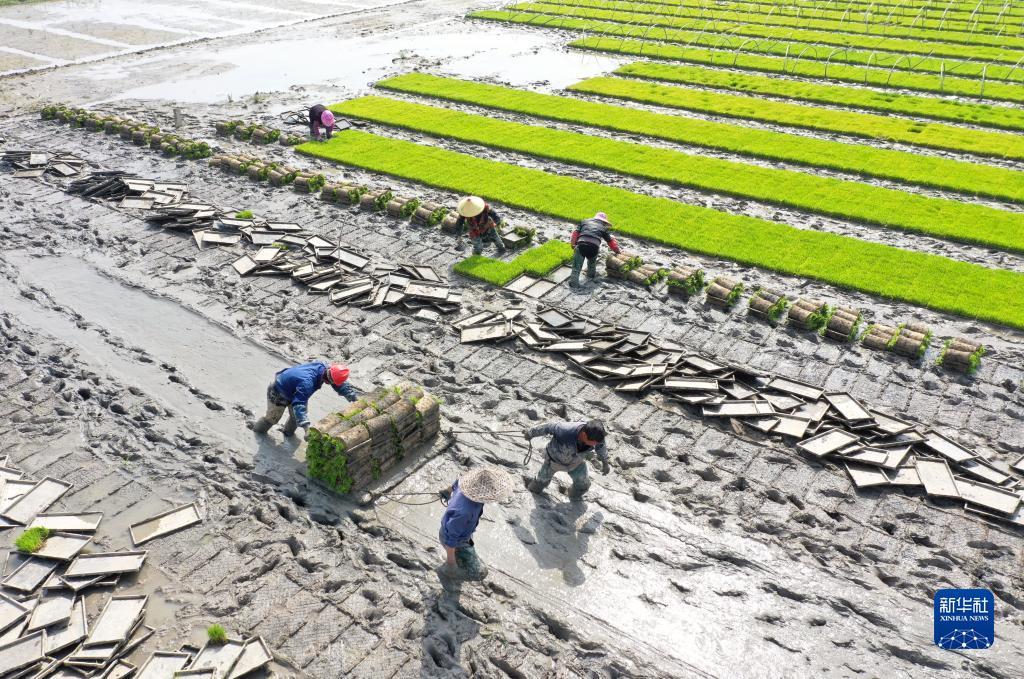 4月16日,浙江省樂清市城東街道農民在搬運秧苗(無人機照片)。蔡寬元 攝