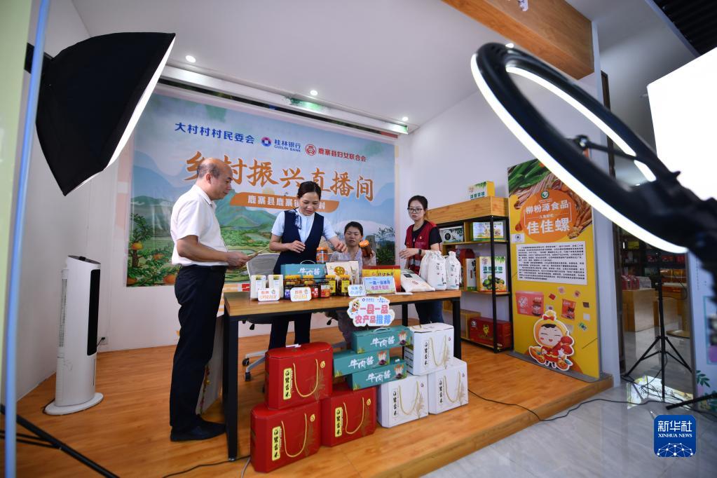 6月14日,在鹿寨縣鹿寨鎮(zhèn)大村村,村干部和村民在準備直播帶貨。記者 黃孝邦 攝