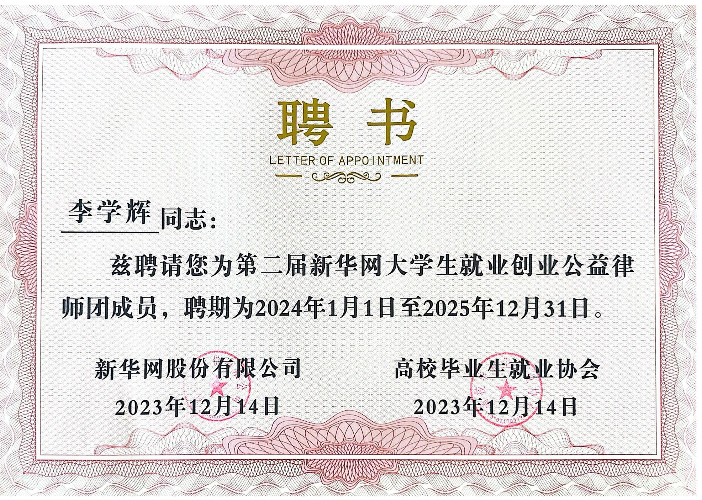 北京市安理律師事務(wù)所黨委副書記、管委會委員李學(xué)輝律師憑借扎實的法律功底、過硬的專業(yè)素養(yǎng)、應(yīng)有的責(zé)任擔(dān)當(dāng),受聘擔(dān)任新華網(wǎng)大學(xué)生就業(yè)創(chuàng)業(yè)公益律師團成員。