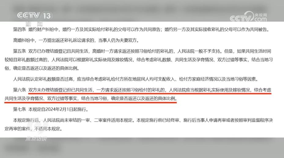 陜西省韓城市人民法院芝陽人民法庭庭長(zhǎng)王春妮:“我們跟原告充分釋法明理,讓他知道咱們國(guó)家有新的規(guī)定,對(duì)他經(jīng)過反復(fù)做工作,他也降低了自己的心理預(yù)期。被告這邊認(rèn)為我跟你在一起共同生活了,我也是實(shí)心想跟你過日子,但是因?yàn)闆]有領(lǐng)證,而且我還跟你共同生育了一個(gè)孩子,你現(xiàn)在要求我給你返還彩禮,我就不愿意返還,心里有抵抗情緒。”