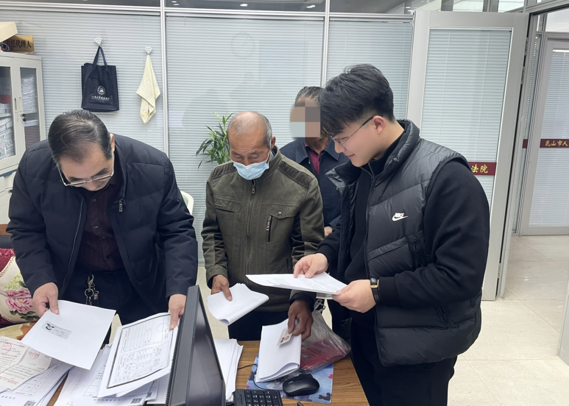 在市人民法院立案庭一線跟班學習鍛煉的乳山市委政法委王鑫源(右一)
