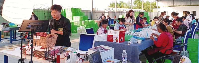 網(wǎng)絡(luò)主播在金臺(tái)區(qū)櫻桃分揀打包現(xiàn)場進(jìn)行直播帶貨