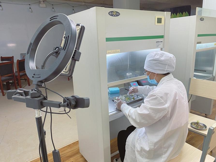 陽(yáng)城縣町店鎮(zhèn)紅薯種植科技產(chǎn)業(yè)園直播基地里,技術(shù)員正在進(jìn)行紅薯苗脫毒速繁直播