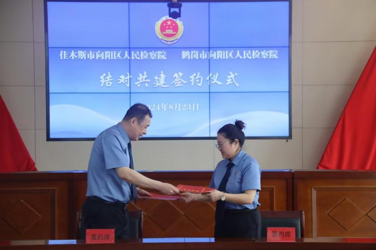 座談交流,凝聚共識。在隨后召開的座談會上,兩院檢察長分別介紹了本院基本情況,互相通報了今年以來在政治建設(shè)、業(yè)務(wù)建設(shè)、隊伍建設(shè)、品牌建設(shè)、典型案例等方面取得的工作成效;圍繞《結(jié)對共建工作方案》進一步開展了研討磋商,就共建目標任務(wù)、具體實施路徑等方面進一步細化了措施,確定了隊伍建設(shè)、業(yè)務(wù)協(xié)作、智慧檢務(wù)、檢察文化等方面的合作共識。在結(jié)對共建簽約儀式上,成立了由雙方主要領(lǐng)導(dǎo)任組長的結(jié)對共建工作領(lǐng)導(dǎo)小組,兩院檢察長現(xiàn)場簽訂了《結(jié)對共建協(xié)議書》,標志著位于佳木斯和鶴崗的兩家向陽檢察攜手啟航,共譜新篇。