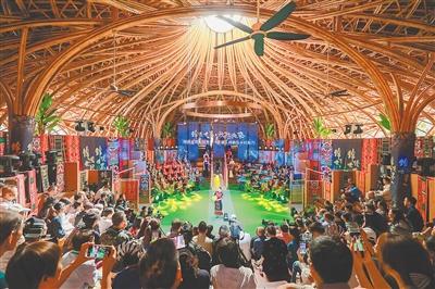 劇場(chǎng)外的廣場(chǎng)上,非遺展示展演時(shí)刻不停。當(dāng)?shù)剡x派的黎族傳統(tǒng)紡染織繡技藝、海南苗族傳統(tǒng)刺繡蠟染技藝、黎族藤編技藝、黎族竹木器樂(lè)、黎族民歌、海南苗族民歌、黎族共同舞、黎族舂米舞、海南苗族盤(pán)皇舞、海南苗族招龍舞等項(xiàng)目的傳承人持續(xù)進(jìn)行展示展演。