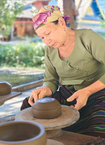 在景萊村的一處木亭里,63歲的玉相論正垂目凝神、轉(zhuǎn)動(dòng)拉坯轉(zhuǎn)輪,一個(gè)普通的陶坯在她手下逐漸變身為帶有壺嘴的陶罐。玉相論43歲才開(kāi)始學(xué)習(xí)傣族慢輪制陶技藝,現(xiàn)在她是西雙版納州級(jí)非遺傳承人?!鞍阎铺盏姆椒▊飨氯ィ彩前汛黾胰说纳罘绞絺飨氯??!庇裣嗾撜f(shuō)。