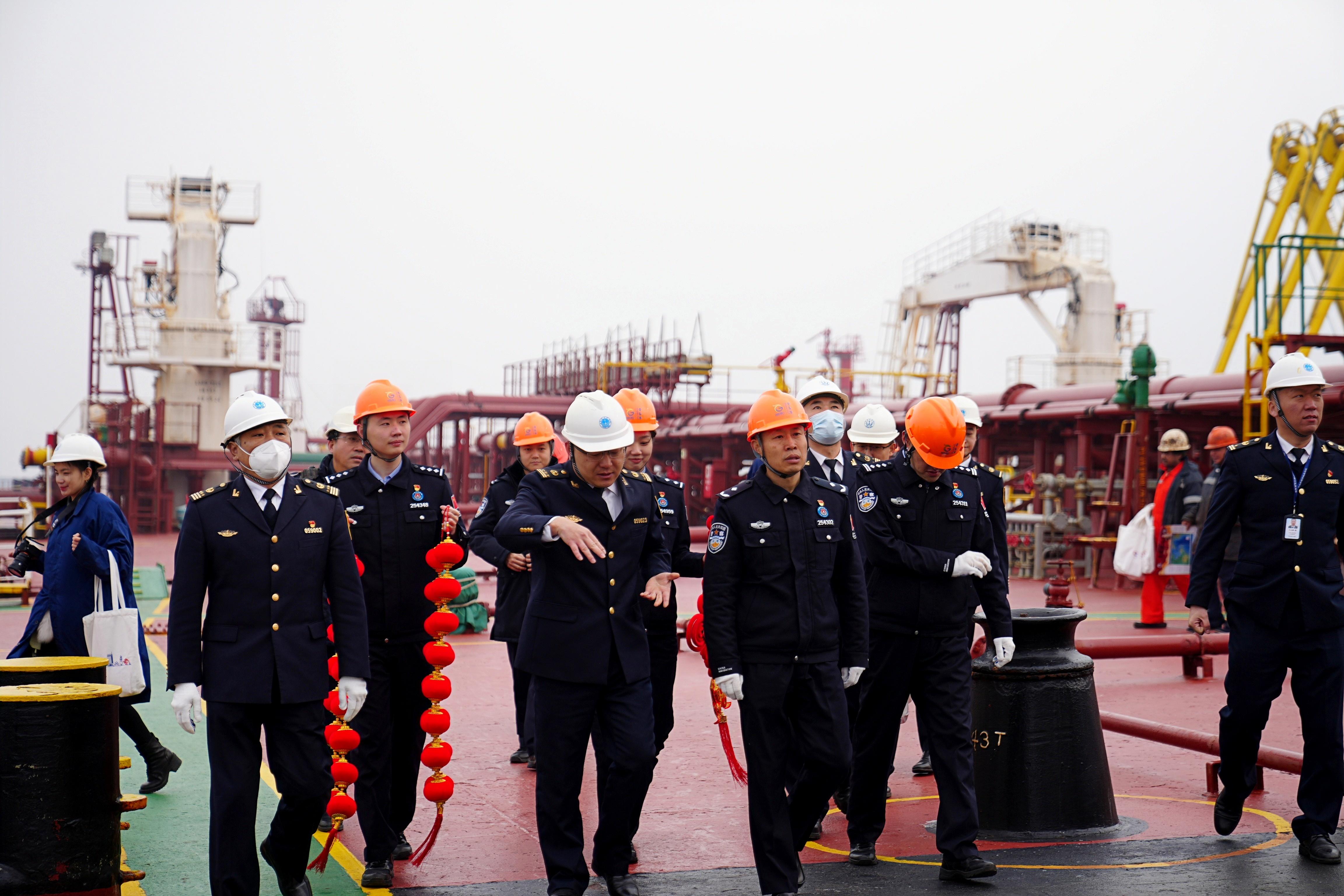 1月22日上午,筆者在董家口港區(qū)油港碼頭看到,圣瑪力諾籍油輪“海天”輪??吭诓次簧希驼丛床粩嗟赝ㄟ^管道從船上輸送到地面儲油罐。據(jù)了解,該輪載有9.5萬噸原油,于半個多月前從馬來西亞駛往山東。1月21日中午,該輪靠泊董家口碼頭并開始卸油,計劃于1月23日完貨離港。