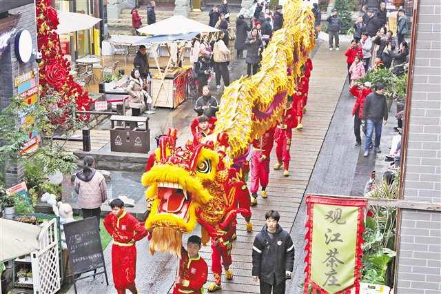 重慶高新區(qū)走馬古鎮(zhèn)用非遺點(diǎn)燃游客的熱情:春節(jié)期間,舞龍隊(duì)、舞獅隊(duì)、花船、腰鼓隊(duì)等在古鎮(zhèn)里巡游;當(dāng)?shù)卮迕褡跃幾匝莸纳徍嵨?、魚燈舞等吸引了十里八鄉(xiāng)的村民前來打卡。